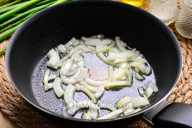 Растопите сливочное масло на сковороде, влейте немного растительного, выложите репчатый лук. Жарьте лук пару минут, до прозрачности.