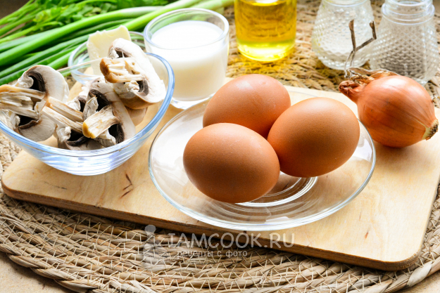 Соберите все продукты для приготовления омлета с луком и грибами на сковороде.