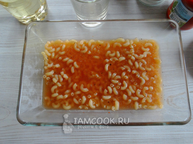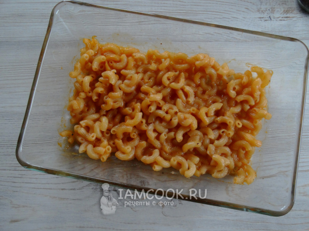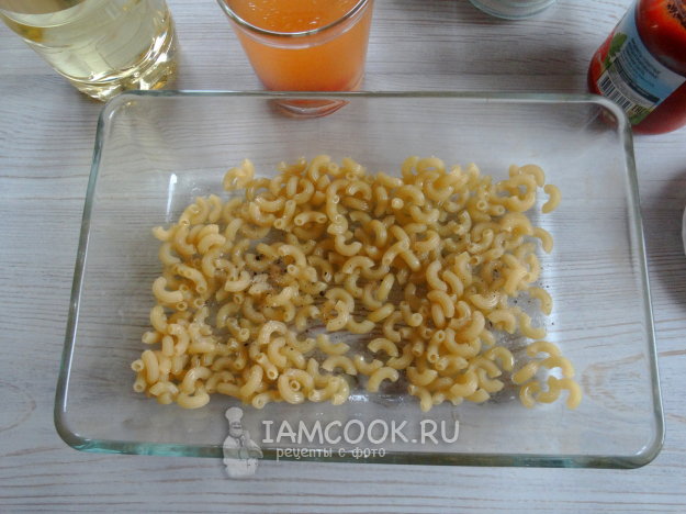 В форму для запекания выложить макароны, полить маслом, посолить и поперчить.