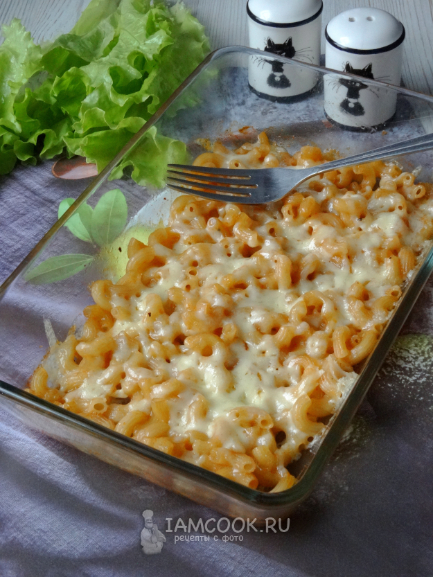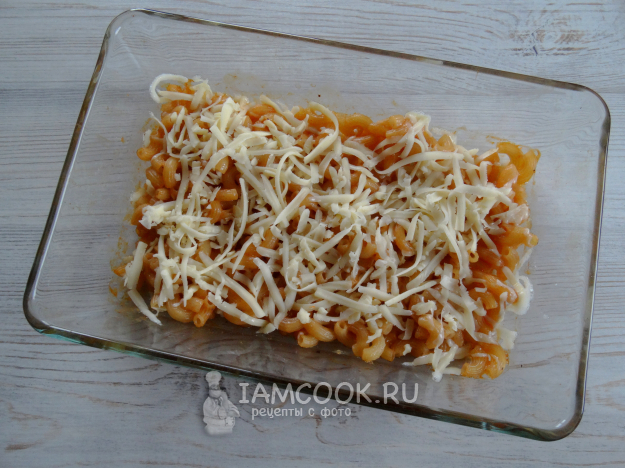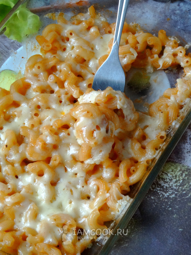 Запекать сырые макароны (в смысле без варки) с сыром в духовке еще несколько минут, чтобы сыр расплавился.