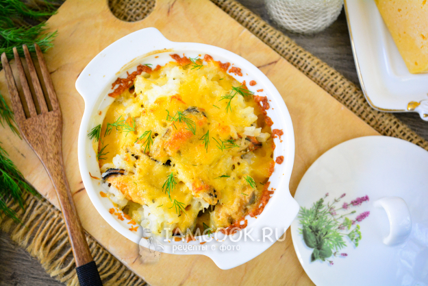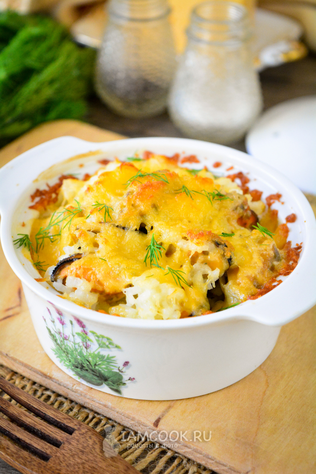 Мидии с рисом распределите в формы для запекания (рамекины или кокотницы). Или это может быть одна большая форма.