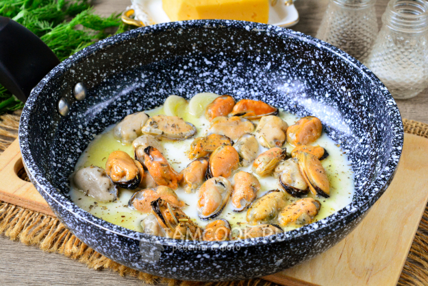 Мидии обжарьте на сковороде с добавлением сливочного масла. Добавьте почищенные зубчики чеснока и жарьте все вместе пару минут. Всыпьте сушеные прованские травы для аромата, посолите и поперчите по вкусу, влейте сливки и томите мидии в соусе на медленном огне еще 5 минут. В конце удалите чеснок, он больше не понадобится.