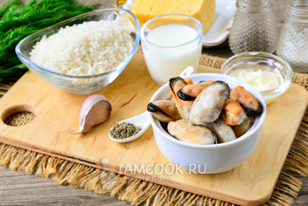 Соберите все необходимые продукты для приготовления мидий, запеченных с рисом.