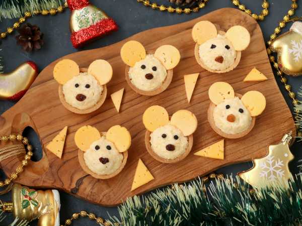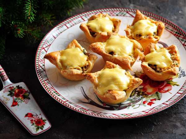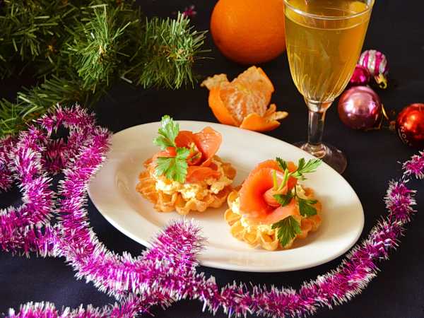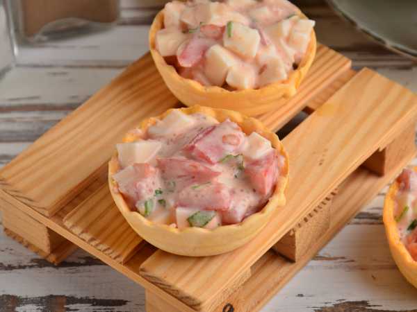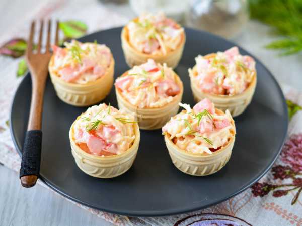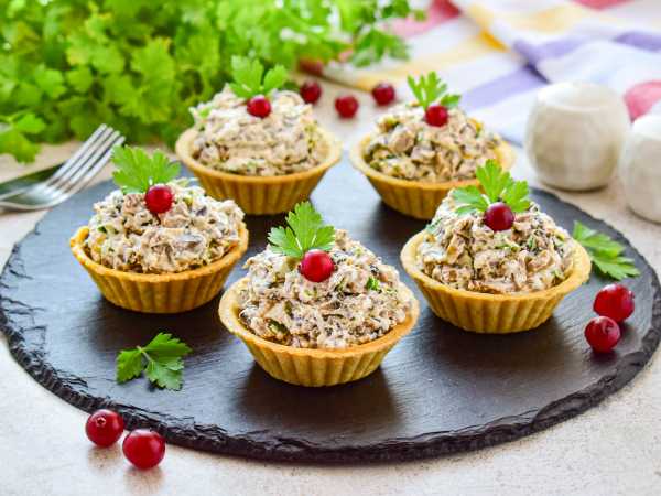 Перед приходом гостей наполните тарталетки начинкой и украсьте листьями салата или другой зеленью.