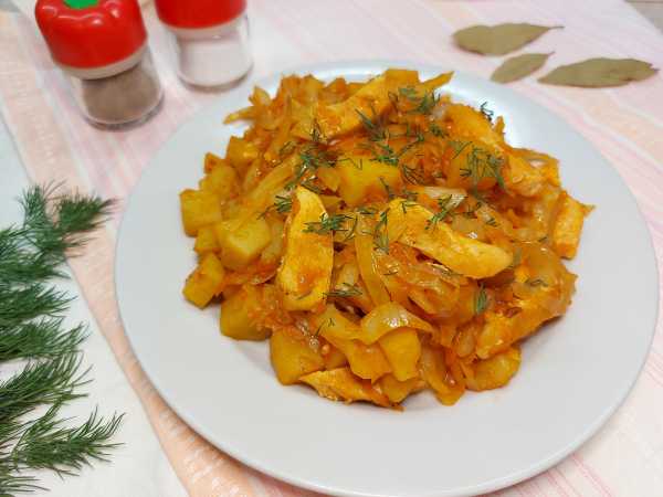 Крышку мультиварки закройте и переключите её в режим "Тушение" на 45-60 минут. Крышку во время тушения открывать не нужно и перемешивать картошку тоже нет необходимости, всё приготовится без вашего участия.