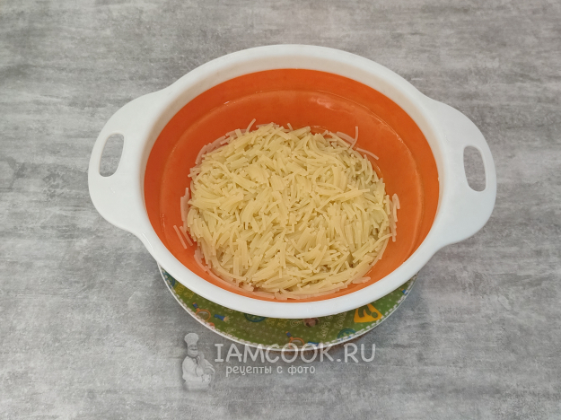 Вермишель отварите согласно инструкции на упаковке в чуть подсоленной воде, откиньте на дуршлаг.