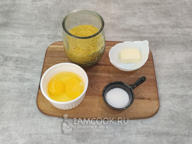 Соберите ингредиенты для приготовления вермишели с сахаром и яйцом.