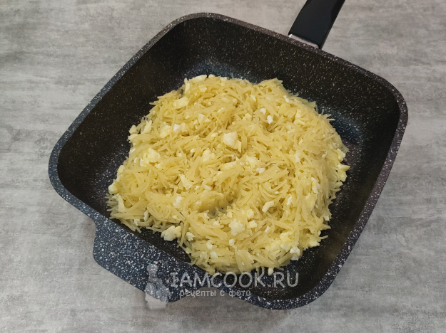 Обжарьте всё вместе пару минут, можно даже слегка подрумянить макароны. И наш завтрак готов!