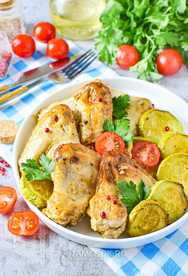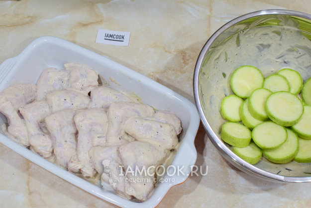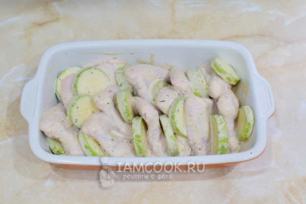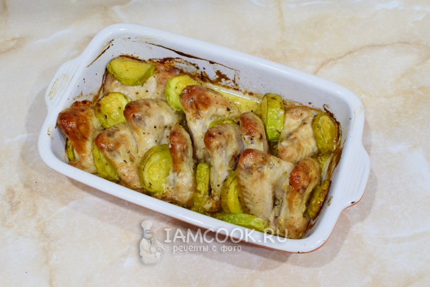 Кружочки кабачков разложите в форме между крылышек. Поставьте куриные крылышки с кабачком в духовку, предварительно разогретую до 180 градусов, примерно на 45-60 минут.