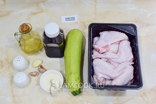 Чтобы приготовить куриные крылышки с кабачком в духовке, соберите все необходимые ингредиенты по списку.