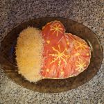 На тарелку выкладываем рис в форме варежки деда Мороза. Сверху смазываем майонезом.