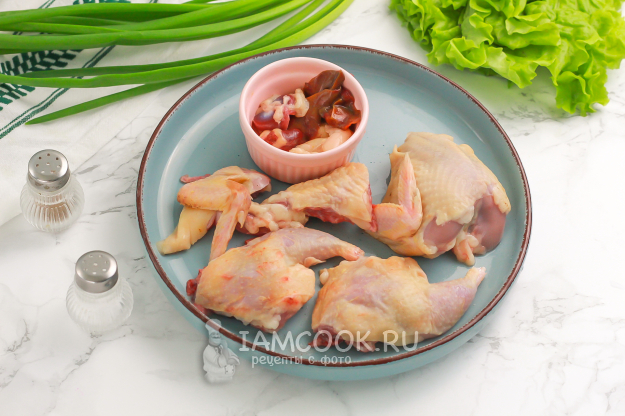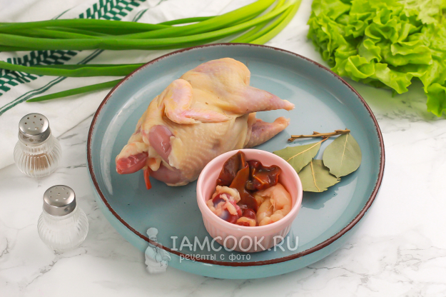 Тщательно промойте тушку перепелки и разрежьте ее на несколько частей. Промойте субпродукты, если они в наличии.