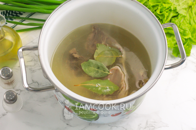 Снова залейте горячую воду и отварите после закипания на умеренном нагреве около 50 минут. В самом конце добавьте лавровые листья и соль. По желанию можно всыпать немного молотого черного перца.