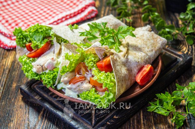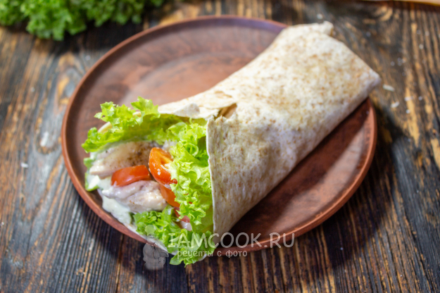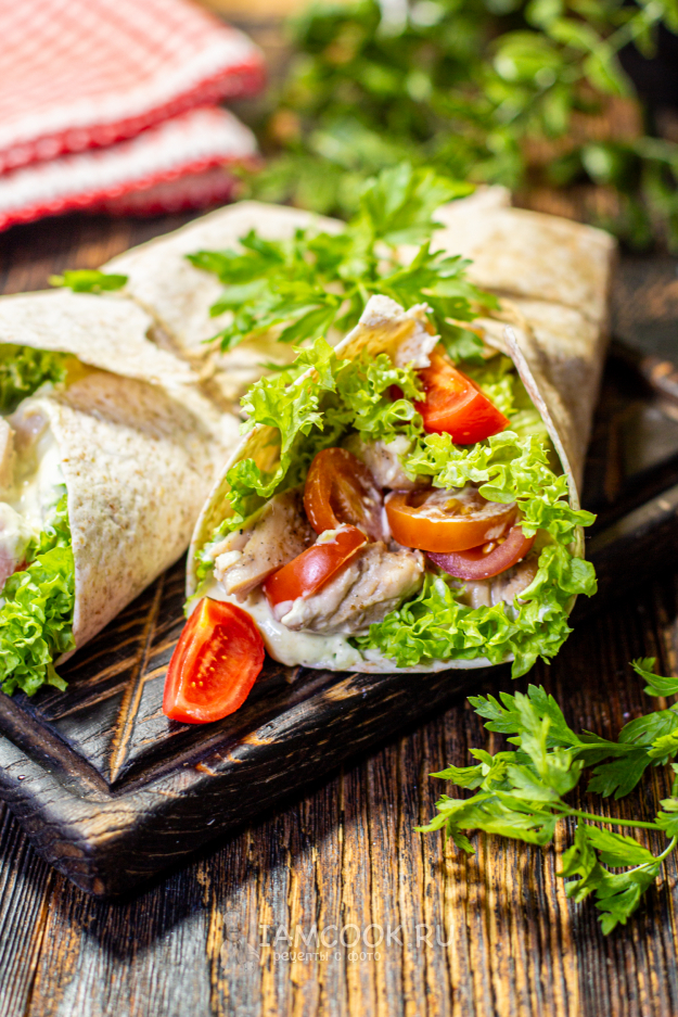 Аккуратно заверните тортилью в конверт. Можно подсушить пару минут на сухой сковороде-гриль или на электрическом гриле.