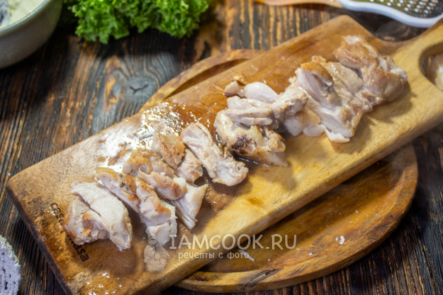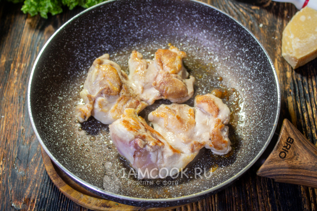 Переложите обжаренные куриные бедра на доску и нарежьте на небольшие кусочки.