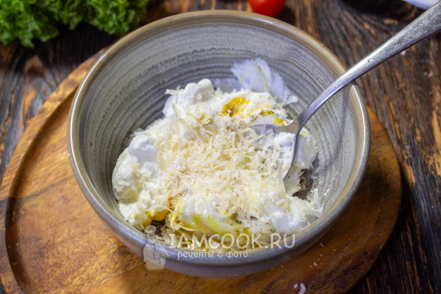 Приготовьте соус: смешайте густой греческий йогурт, не очень острую горчицу, чеснок измельченный, немного тертого пармезана. Посолите и поперчите соус по вкусу.