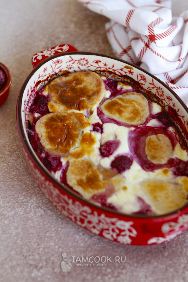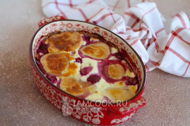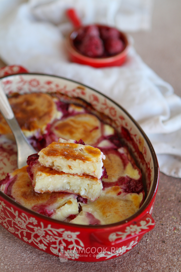 Сырники выложите в форму для запекания. Добавьте ягоды по сезону (у меня замороженная малина).