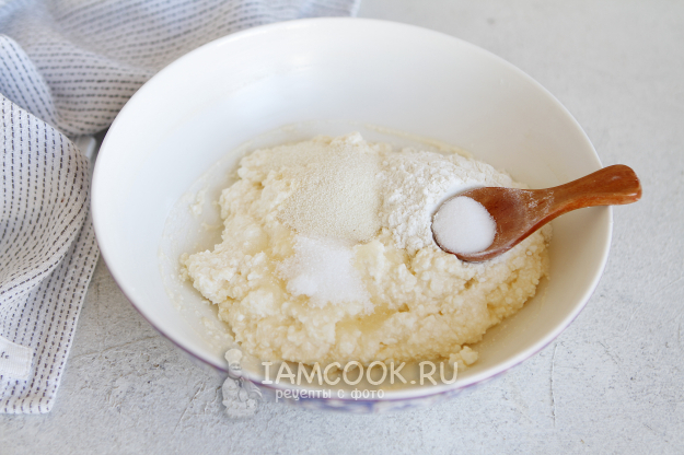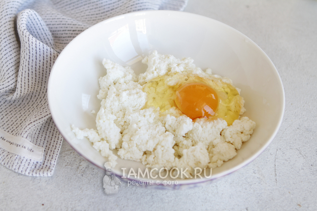 В чашу для замеса отправляем творог и одно яйцо. Перетираем оба ингредиента.