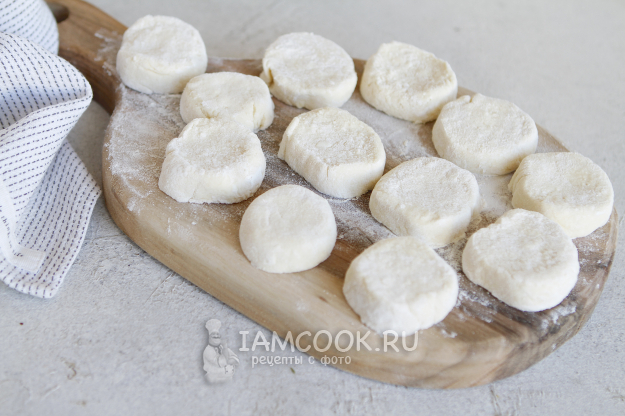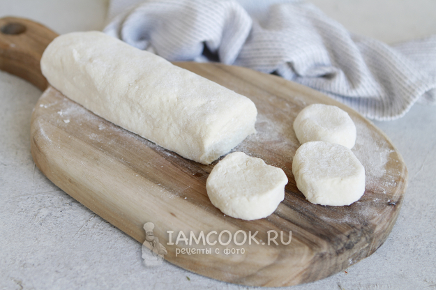 Рабочую поверхность присыпьте мукой. Из теста сформируйте колбаску. И при помощи ножа нарежьте колбаску на шайбы одинакового диаметра.