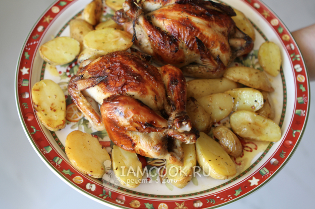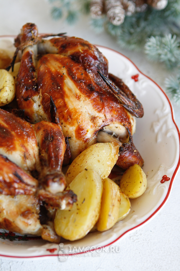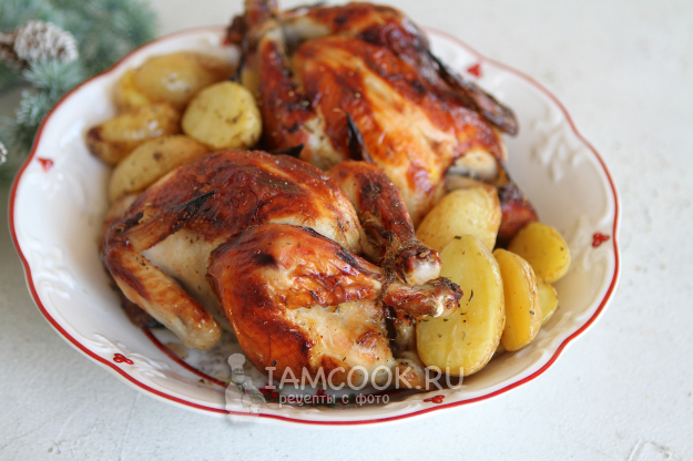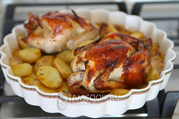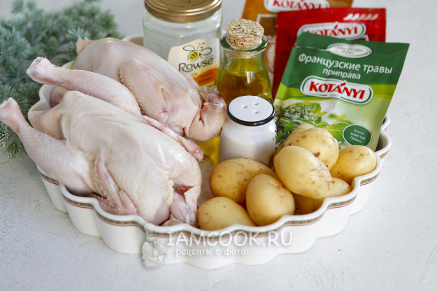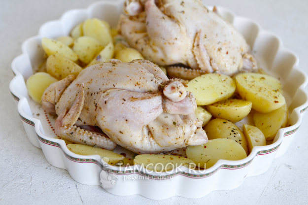 Продукты для приготовления цыплят-корнишонов в духовке с картошкой - перед вами. Цыплята корнишоны (английское название Cornish hen) имеют вес до 500 г. У них очень нежное и вкусное мясо. Перегружать их специями и другими дополнениями не обязательно. Они сами по себе хороши.