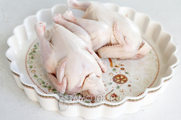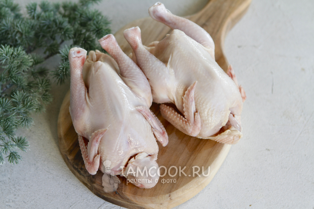 Цыплят промыть под проточной водой и обсушить бумажным полотенцем. Мелкие цыплята готовятся по одному на каждого гостя.