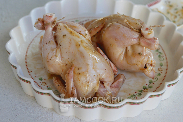 Смажьте цыплят готовым маринадом со всех сторон. Свяжите ножки цыплят, чтобы они сохранили красивую форму.