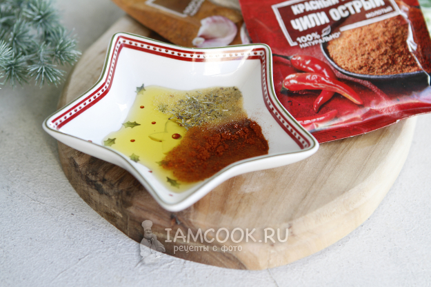 Для маринада приготовить оливковое масло, мед, травы. Все ингредиенты тщательно перемешать.