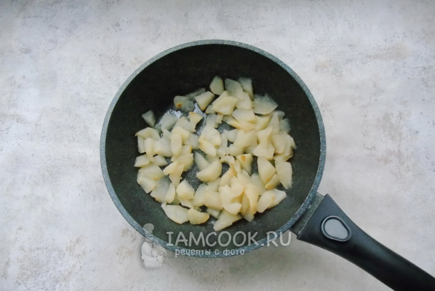 Накройте сковороду крышкой и тушите груши до мягкости.