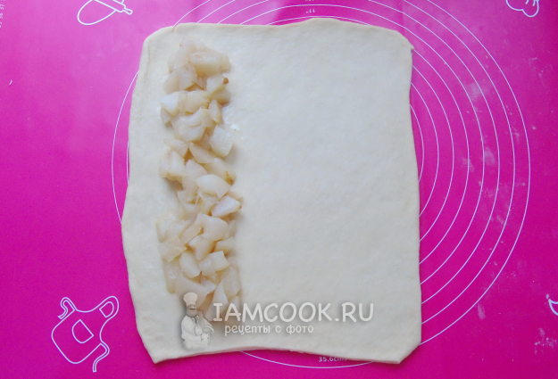 Готовое к работе тесто раскатайте в прямоугольник. Немного отступая от края теста, выложите на него приготовленные на сковороде груши.
