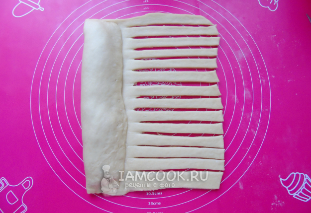 Накройте груши тестом и закрепите край. Оставшуюся широкую часть теста нарежьте полосками.