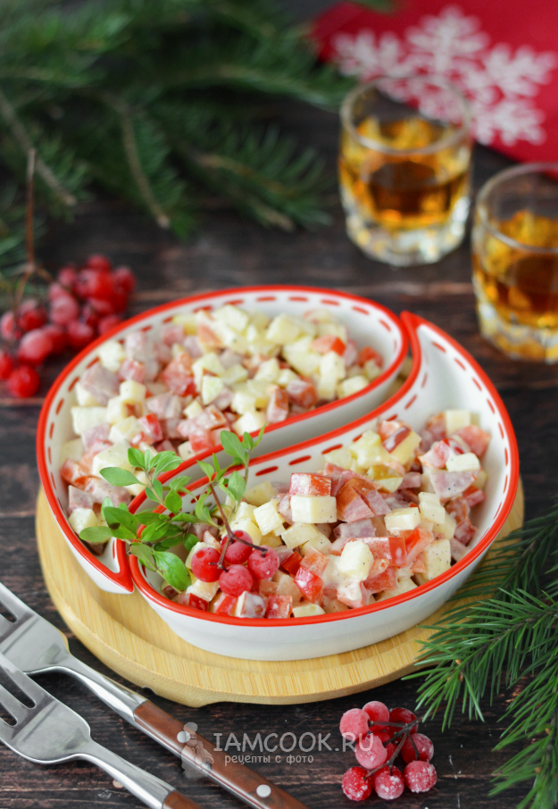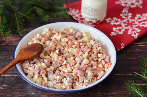 Салат с болгарским перцем, колбасой и сыром готов! Переложите его в новогодний салатник и подавайте сразу же к столу.