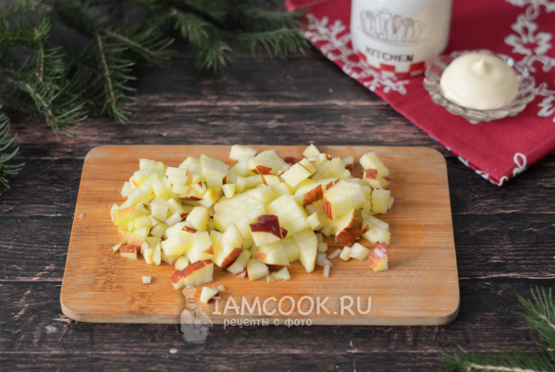 В последнюю очередь нарежьте кубиком яблоко, чтобы оно не потемнело.