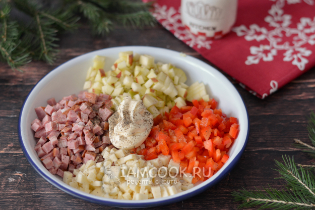 Сложите все нарезанные ингредиенты в миску, поперчите по вкусу и добавьте майонез.