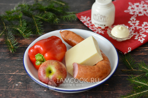 Вот тот набор ингредиентов, который потребуется для приготовления салата с болгарским перцем, колбасой и сыром.