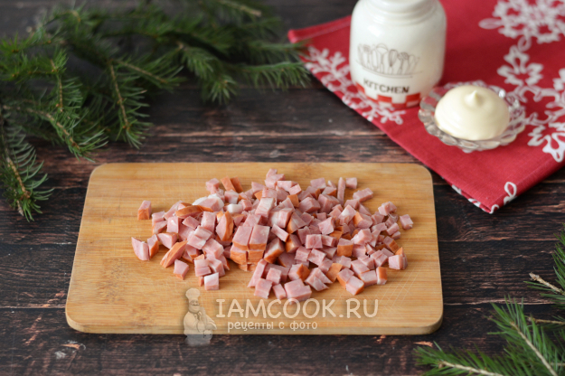 Я выбрала нарезку кубиком. Первым делом нарежьте колбасу.