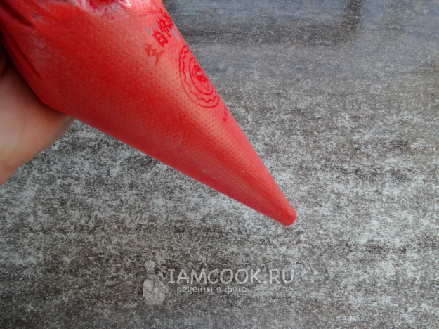 Переложить тесто в кондитерский мешок, отрезать кончик.