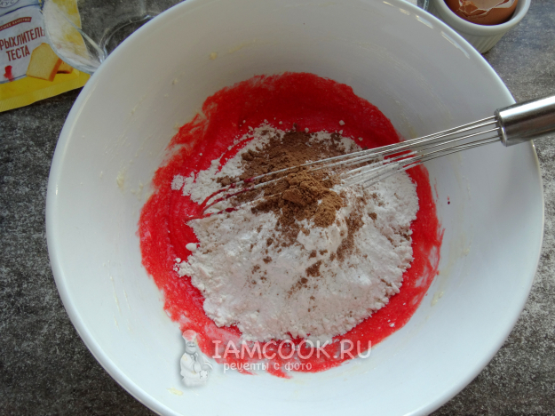 Насыпать муку, какао и разрыхлитель.