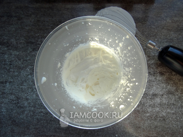 Холодные сливки взбить с сахаром до устойчивого крема.