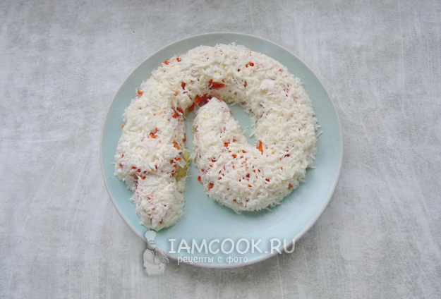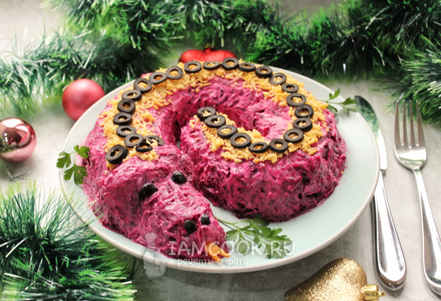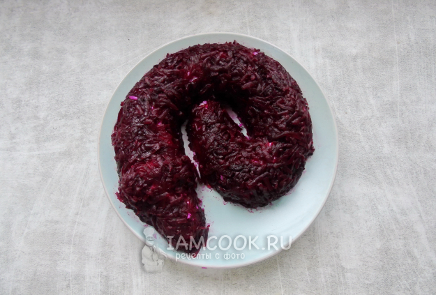 Отварную свеклу очистите и натрите на терке с крупными ячейками. Весь салат покройте свеклой.
