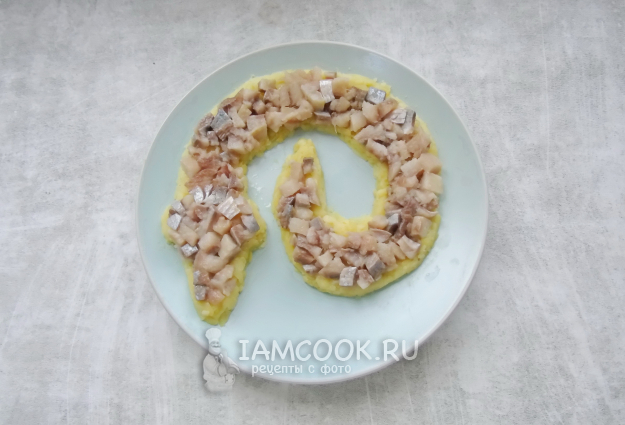 Филе сельди мелко нарежьте и покройте слой картошки. Можно взять уже готовое филе. Но если вы решите разделать сельдь сами, то тщательно уберите все косточки. Покройте и этот слой майонезом.
