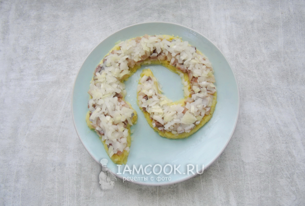 Репчатый лук очистите, помойте и мелко нарежьте. Выложите в миску и залейте кипятком на 5-6 минут. После воду слейте, а лук отожмите. Это позволит убрать горечь. Лук станет следующим слоем салата. Его можно не покрывать майонезом.