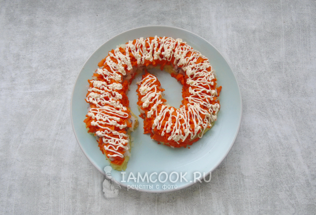 Отварную морковь очистите и натрите на терке, как и картошку. Выложите на лук и покройте майонезом.