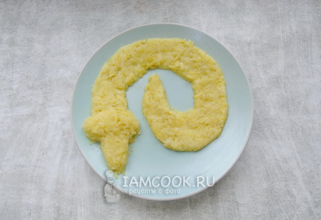 Картошку очистите и натрите на терке с крупными ячейками. Выложите на блюдо в виде змеи. Покройте майонезом.
