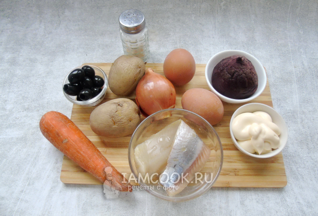 Соберите ингредиенты для приготовления селедки под шубой на год Змеи. В подсоленной воде отварите картошку, морковь и свеклу. Яйца сварите вкрутую. Дайте этим ингредиентам остыть.