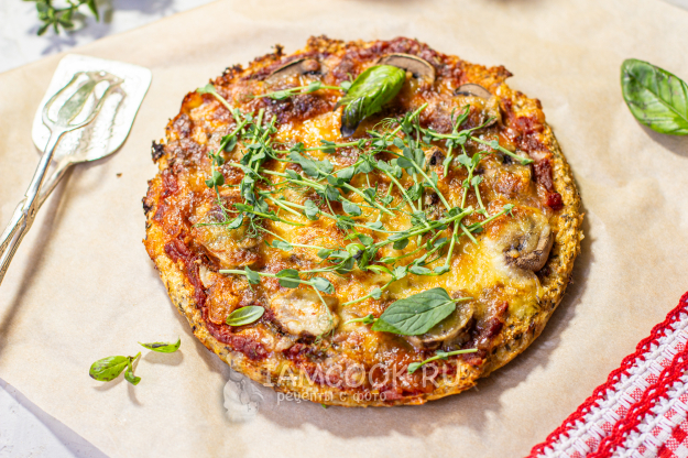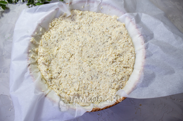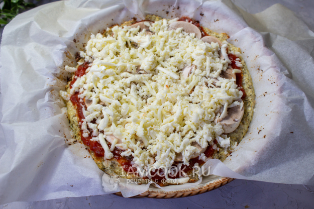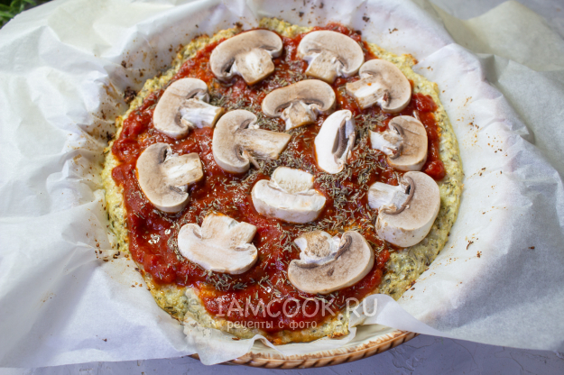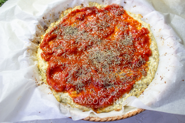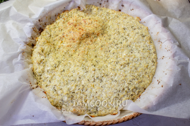 Круглую форму диаметром 26-28 см с низкими бортами выстелите пергаментом. На него выложите приготовленную основу из цветной капусты, разровняйте руками или лопаткой в пласт толщиной в 1-1,5 см. Поставьте в разогретую до 180 градусов духовку на 15 минут.
