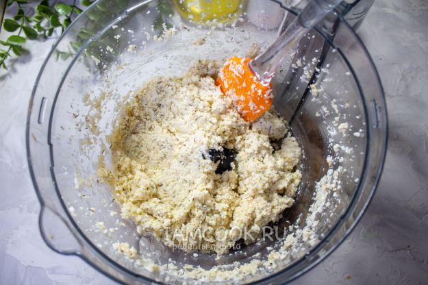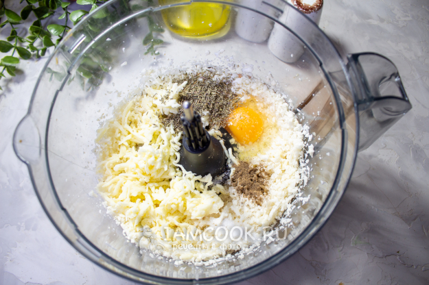 Добавьте куриное яйцо, сушеные травы, соль, перец и тертый сыр. Снова всё перемешайте в измельчителе.