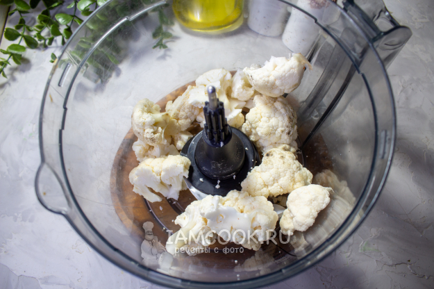 Для приготовления основы для пиццы помойте и обсушите цветную капусту. Разберите ее на соцветия и выложите в чашу измельчителя. Измельчите капусту в мелкую крошку.