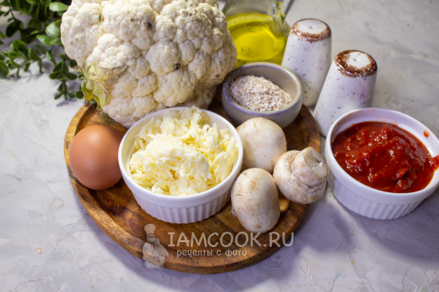 Соберите необходимые продукты для приготовления ПП пиццы из цветной капусты с грибами. Для начинки я использовала томатный соус с базиликом, немного свежих шампиньонов и сыр "Моцарелла".