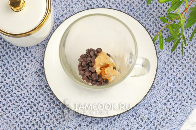 В чашку или стакан выложите арахисовую пасту и капли шоколада любого сорта. Если капель нет в наличии, то просто натрите примерно 30 г шоколада на терке с мелкими ячейками.