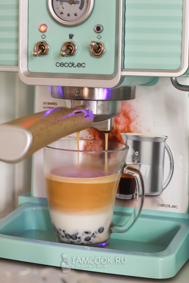Приготовьте ароматный кофе, наливая его сразу в чашку со сливками. Помните о том, что сверху емкости должно остаться немного свободного места для пенки и топпинга.